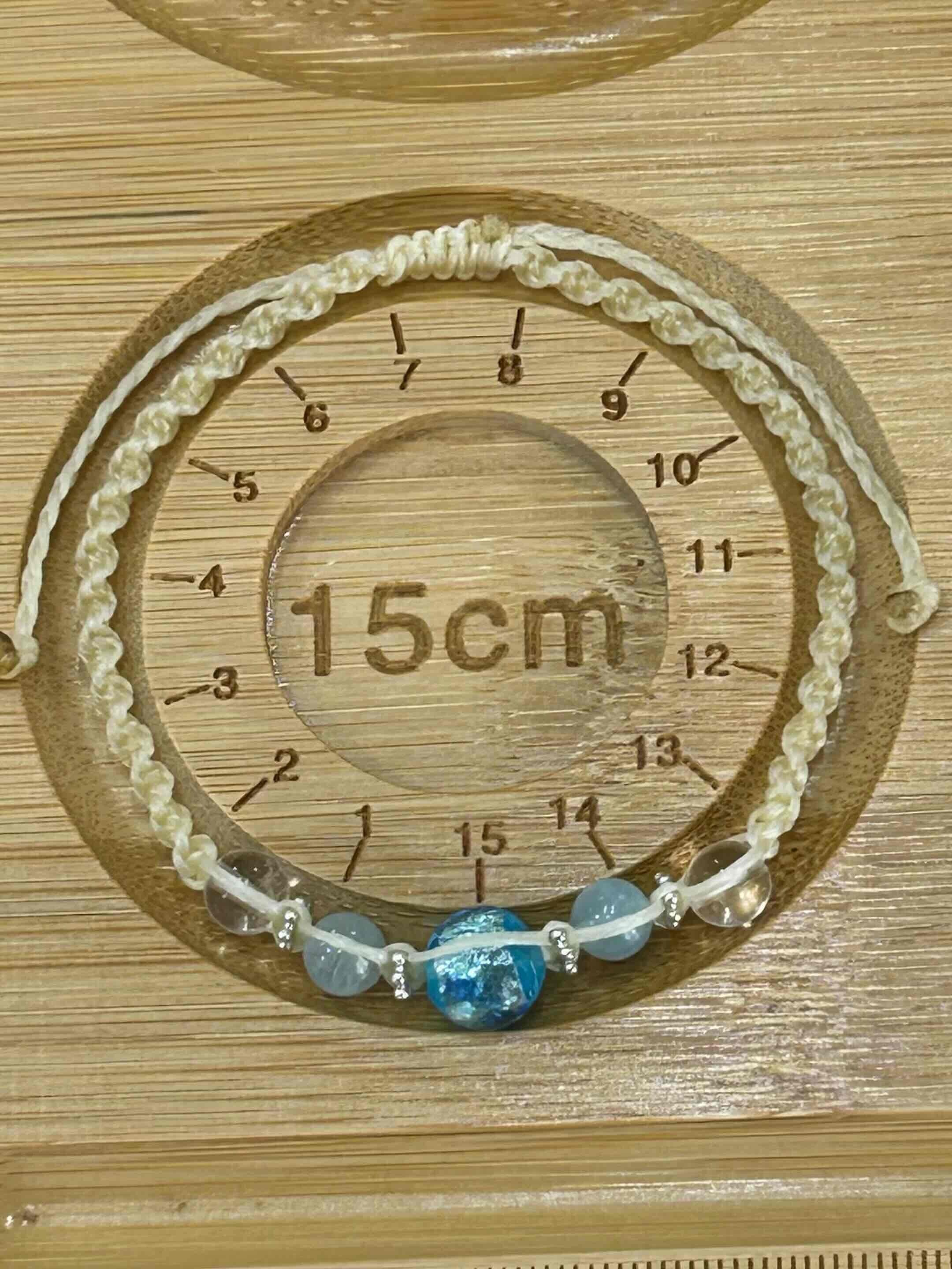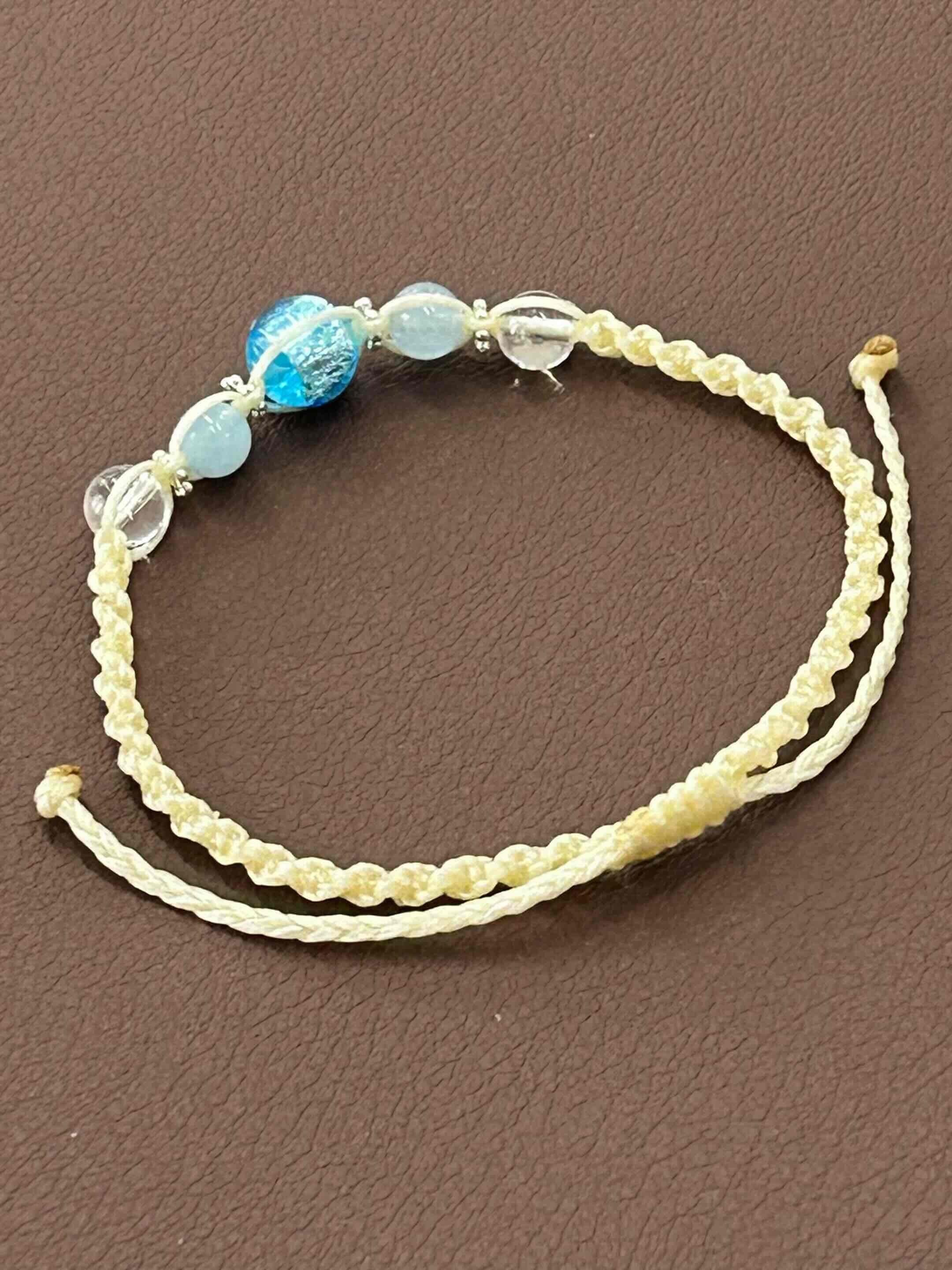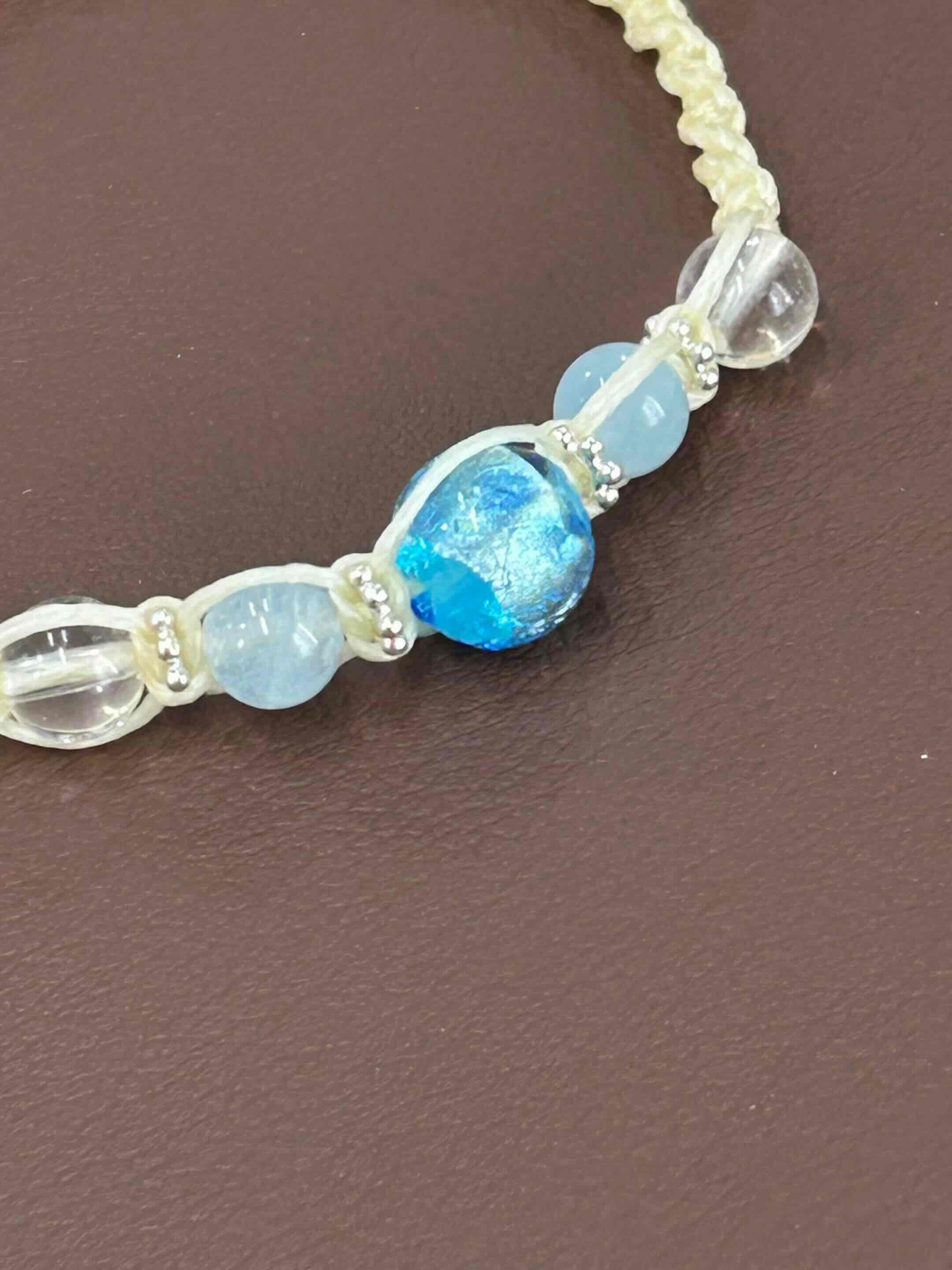 蓄光タイプのライトブルーのホタルガラスとアクアマリン・天然水晶をワックスコードで編み込みました。